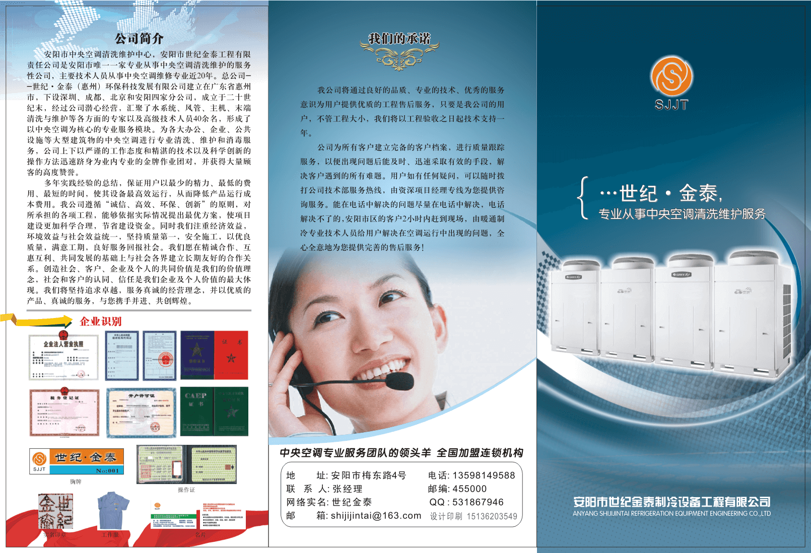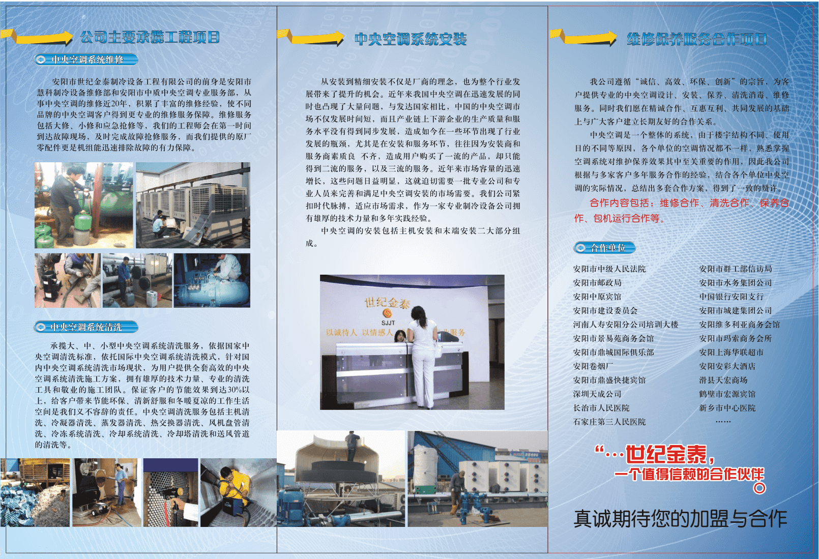 新一代企業(yè)的目標是組合各種資源,為社會服務(wù),為社會和大眾創(chuàng)造價值。世紀金泰(安陽)空調(diào)設(shè)備工程有限公司作為一家年輕的公司,在十幾年的艱苦創(chuàng)業(yè)中,一步一個腳印,在實干中形成了一種“以質(zhì)取勝,以誠取信”的意識,并將此貫穿在公司各個環(huán)節(jié)的管理和經(jīng)營上,使公司在取得良好的經(jīng)濟效益的同時,樹立了良好的社會形象。在激烈的市場競爭中,世紀金泰正是因為可靠的質(zhì)量和誠實的信譽,才能站穩(wěn)腳跟,贏得消費者,拓展了市場。公司視誠信為立身之本、發(fā)展之基、信譽之源。公司奉行全方位的誠信理念。企業(yè)、管理者及職工都要講求誠信。不僅公司內(nèi)部要講求誠信,在同社會、客戶和合作者交往中也要講求誠信。誠信集中體現(xiàn)在高標準的職業(yè)道德和商業(yè)道德上。